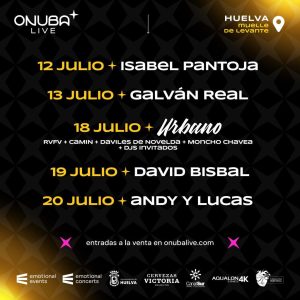 El próximo mes de julio se celebrará en Huelva el Festival Onuba Live, un nuevo ciclo de conciertos que tendrá como escenario el Muelle de Levante, una de las zonas más emblemáticas de la ciudad, y contará en esta primera edición con la actuaciones de Isabel Pantoja (12 de julio), Galván Real (13 de julio), RVFV+Camin+Daviles de Novelda+Moncho Chavea (18 de julio), David Bisbal (19 de julio) y Andy y Lucas (20 de julio).