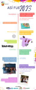 Se han sumado nuevos festivales, hemos cruzado el charco, contratado más del triple de personas con discapacidad en relación al año anterior, preparado una obra de teatro inclusiva, formado a muchas personas o lanzado una web accesible, entre otras actividades, en tan sólo 12 meses y con el mínimo de recursos.